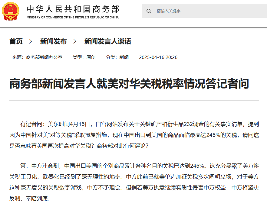 有记者问:美东时间4月15日,白宫网站发布关于关键矿产和衍生品232调查的有关事实清单,提到因为中国针对美“对等关税”采取报复措施,现在中国出口到美国的商品面临最高达245%的关税,请问这是否意味着美国再次提高对华关税?商务部对此有何评论?
