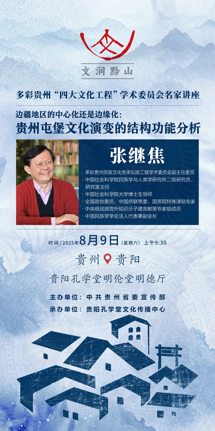 8月9日,多彩贵州“四大文化工程”学术委员会名家讲座第五期将在贵阳孔学堂举办。受贵州省委宣传部邀请,多彩贵州民族文化传承弘扬工程学术委员会副主任委员,中国社会科学院民族学与人类学研究所二级研究员、研究室主任,中国社会科学院大学张继焦教授将来贵讲学,主题为《边疆地区的中心化还是边缘化:贵州屯堡文化演变的结构功能分析》。