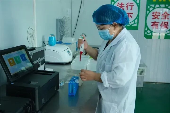 松桃食材配送公司检测中心工作人员正在对采购的食材进行二次检测。