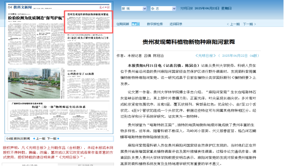 2025年6月22日,光明日报第4版刊发《贵州发现菊科植物新物种麻阳河紫菀》。