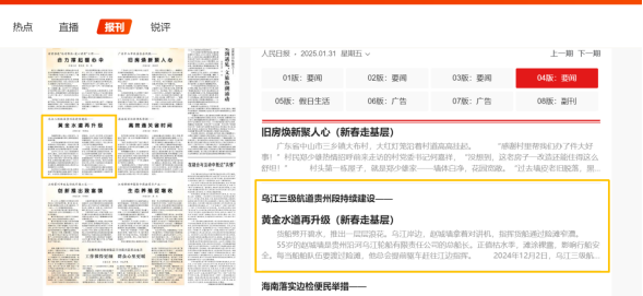 2025年1月31日,人民日报第4版刊发《乌江三级航道贵州段持续建设——黄金水道再升级(新春走基层)》。