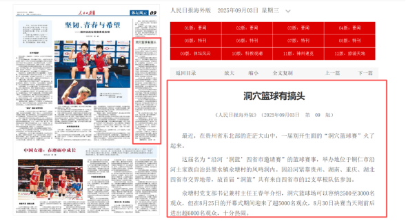 2025年9月3日,人民日报海外版第9版刊发《洞穴篮球有搞头》。