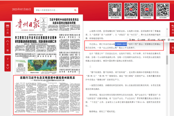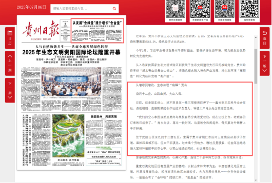 2025年7月6日,贵州日报头版头条刊发《以发展“含绿量”提升增长“含金量”——贵州持续在生态文明建设上出新绩》。