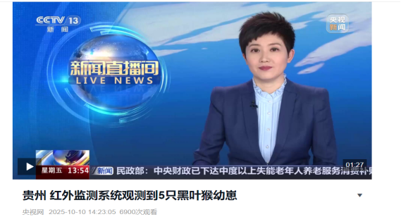 2025年10月14日,中央广播电视总台—13频道刊播《贵州 红外监测系统观测到5只黑叶猴幼崽》视频报道。
