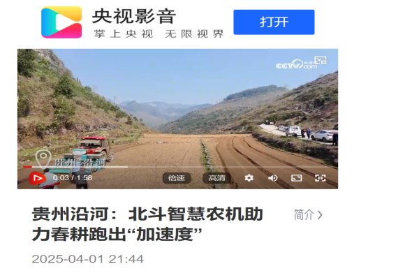 2025年4月1日,央视网刊播《贵州沿河:北斗智慧农机助力春耕跑出“加速度”》视频报道。