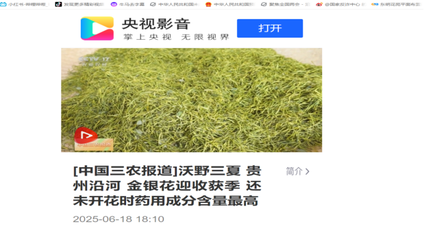 2025年6月18日,中央广播电视总台——农业农村频道刊播《沃野三夏 贵州沿河 金银花迎收获季 还未开花时药用成分含量最高》视频报道。