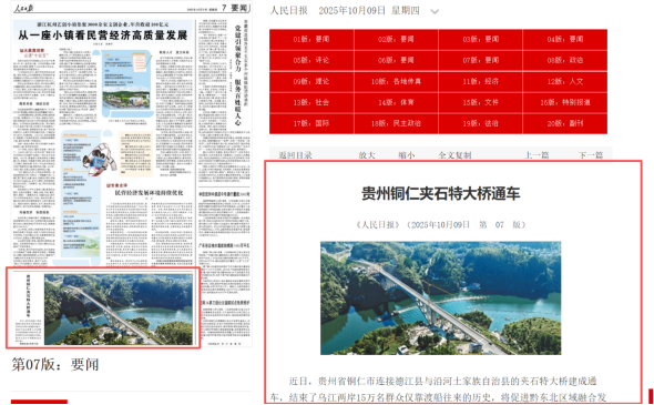 2025年10月9日,人民日报第7版刊发《贵州铜仁夹石特大桥通车》。