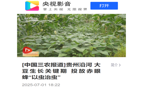 2025年7月1日,中央广播电视总台——农业农村频道刊播《贵州沿河 大豆生长关键期 投放赤眼蜂“以虫治虫”》视频报道。