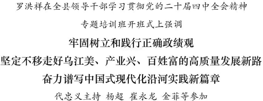 4月15日,全县领导干部学习贯彻党的二十届四中全会精神专题培训班开班。县委书记罗洪祥出席开班式并作专题辅导报告。他强调,要深入学习贯彻习近平总书记在党的二十届四中全会和省部级主要领导干部专题研讨班开班式上的重要讲话精神,全面贯彻落实习近平总书记在贵州考察时的重要讲话精神和对贵州对铜仁工作重要指示批示精神,深刻领悟把握省委、市委有关工作部署,牢固树立和践行正确政绩观,坚定不移走好乌江美、产业兴、百姓富的高质量发展新路,奋力谱写中国式现代化沿河实践新篇章。