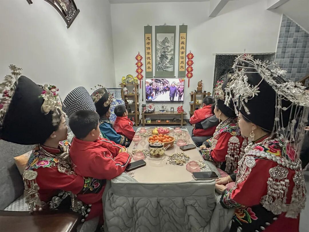 图为2025年3月18日,松桃苗族自治县盘信镇小隆村苗族群众正在收看中央广播电视总台3月18日《新闻联播》。申逸恺 摄