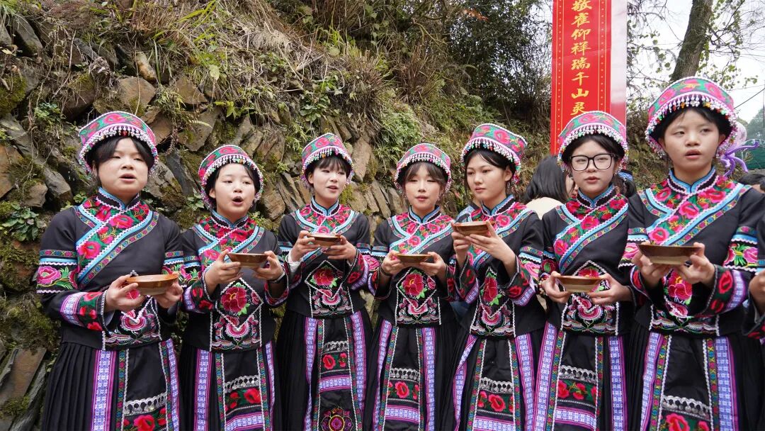 图为2025年2月28日,石阡县坪山乡尧上村仡佬族敬雀节民俗活动仡佬族少女手捧拦门酒。杨坤 摄