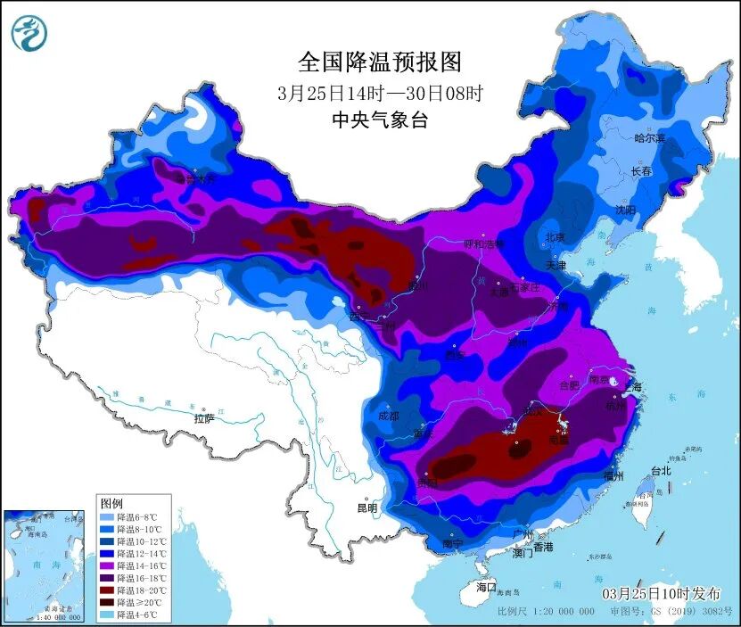 受寒潮影响,预计,3月25日14时至3月30日08时,新疆大部、西北地区大部、内蒙古、黑龙江西部和东南部、吉林东部、辽宁西部、华北、黄淮、江淮、江汉、江南、华南大部以及西南地区东部等地将先后降温8~14℃,其中,内蒙古西部、新疆北疆东部和南疆盆地、甘肃大部、宁夏大部、华北南部、江淮西部、江汉东部、江南中北部、贵州中东部等地部分地区降温可达16~18℃,局地降温超过20℃。过程最低气温将出现在3月29日夜间至30日凌晨,最低温度0℃线将位于华北南部至秦岭一带。