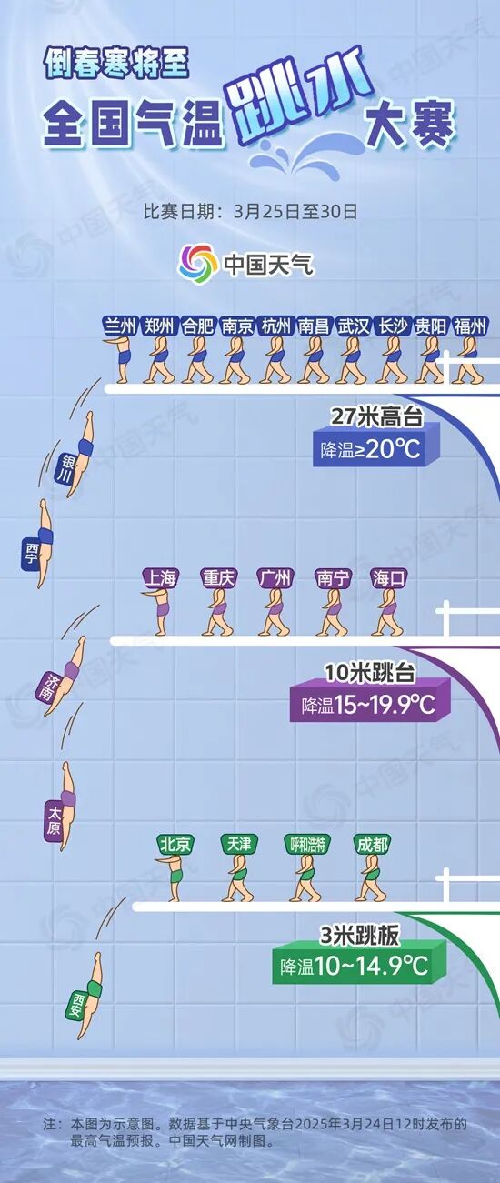据中国天气网消息,今天(3月25日)起,新一轮寒潮将携大风、降温、沙尘、雨雪、强对流天气来袭,给全国多地带来跨季式降温,贵阳等地最高气温降幅可达20℃以上。