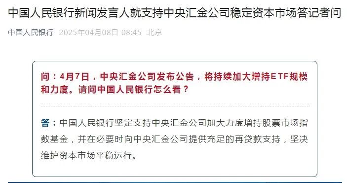 近日,美国政府滥施关税引发全球市场剧烈波动。4月7日,市场迎来“黑色星期一”,A股出现较大跌幅。当日尾盘时分,中央汇金发布公告称,坚定看好中国资本市场发展前景,充分认可当前A股配置价值,并表示已再次增持ETF,未来将继续增持。