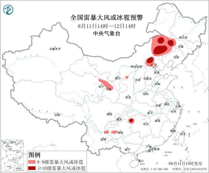 预计8月11日14时至12日14时,内蒙古东部、华北北部、西北地区东部、西南地区东部等地的部分地区将有8级以上雷暴大风或冰雹天气,其中,内蒙古东南部、吉林西部、河北北部、重庆东南部等地的部分地区将有10级以上雷暴大风,最大风力可达11级以上;内蒙古东部、华北北部、西北地区东部、江淮、江汉、江南北部、西南地区东部和南部、华南南部等地的部分地区将有小时雨量大于20毫米的短时强降水天气,其中,江苏中部、湖北西部和南部、湖南北部、四川东部、重庆中西部和东南部、贵州西部和东北部等地的部分地区小时雨量大于50毫米,最大可达70毫米以上。