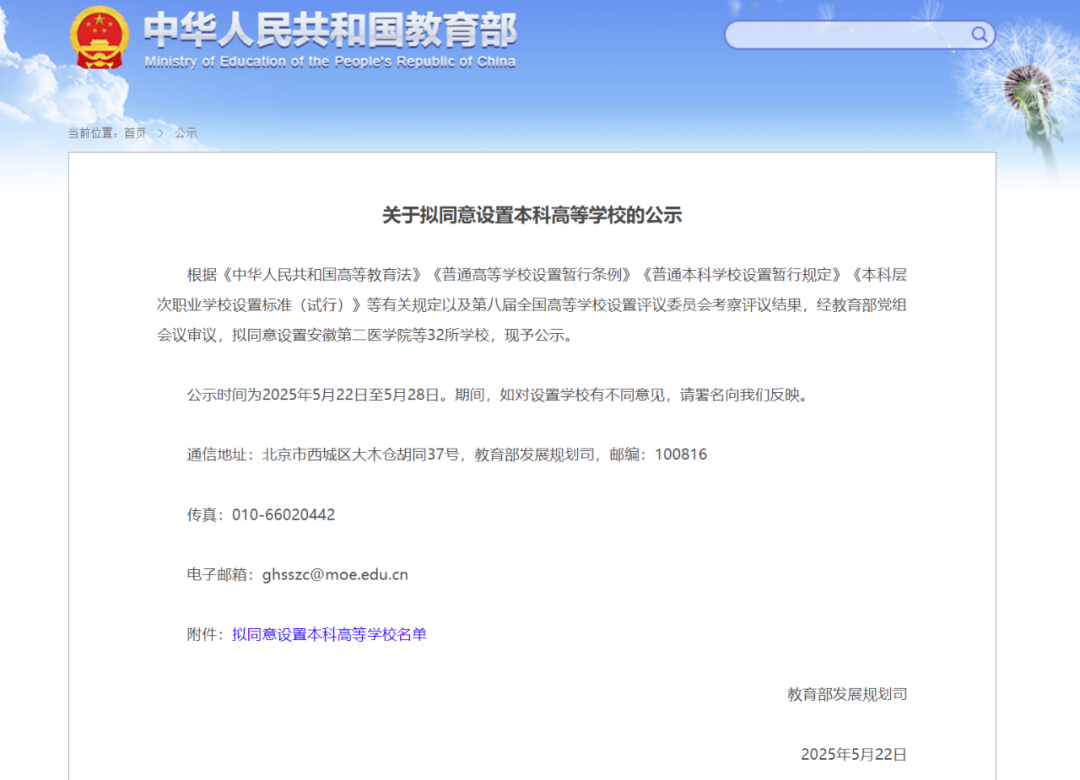 公示时间为2025年5月22日至5月28日。期间,如对设置学校有不同意见,请署名向教育部发展规划司反映。