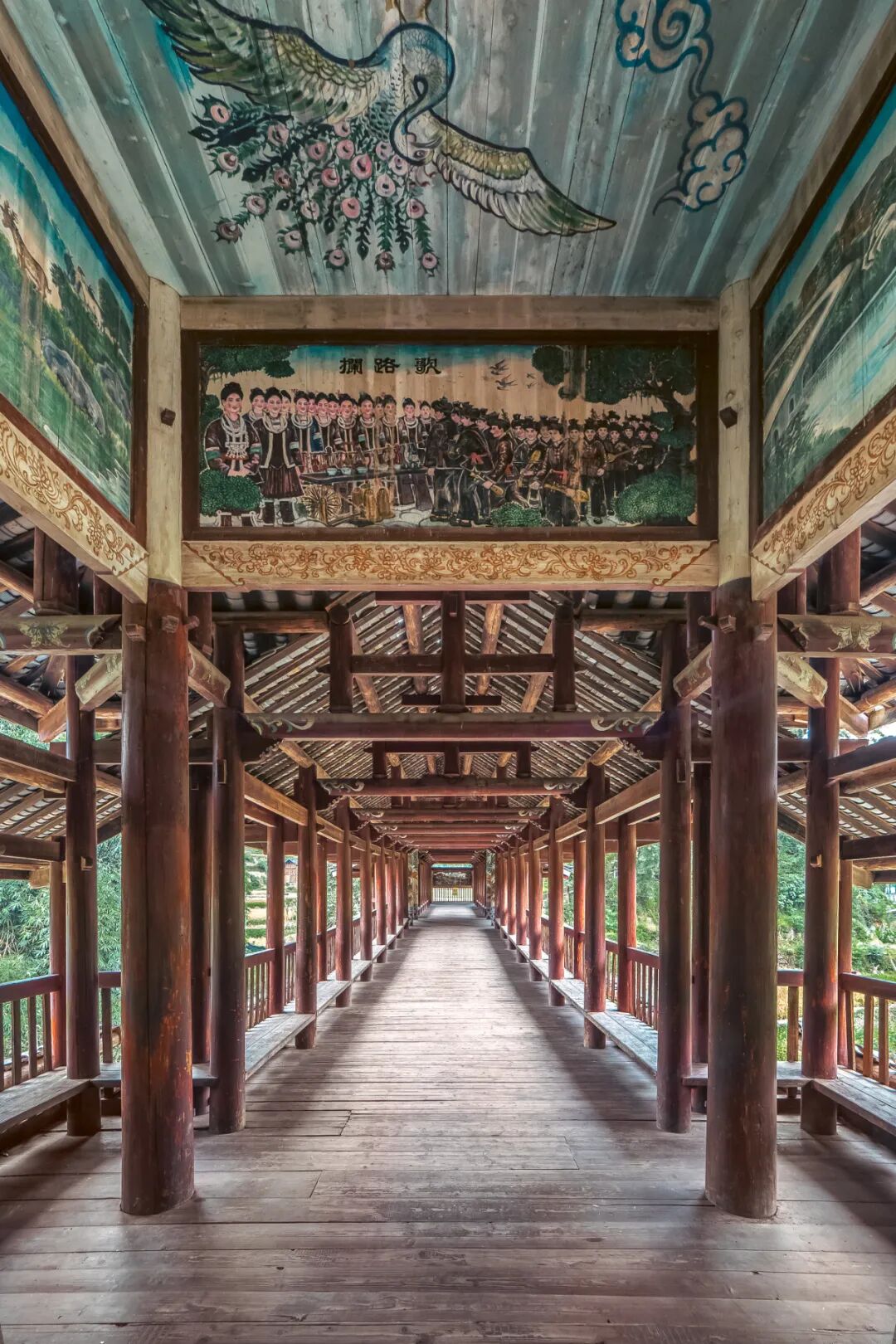 这座清光绪年间用全杉木榫卯搭成的桥,木料皆由附近乡村募集而来,粗壮而坚实,不用钉铁,却把当地侗族人民的日子与各民族的温情,都稳稳托在了56米的桥廊里。