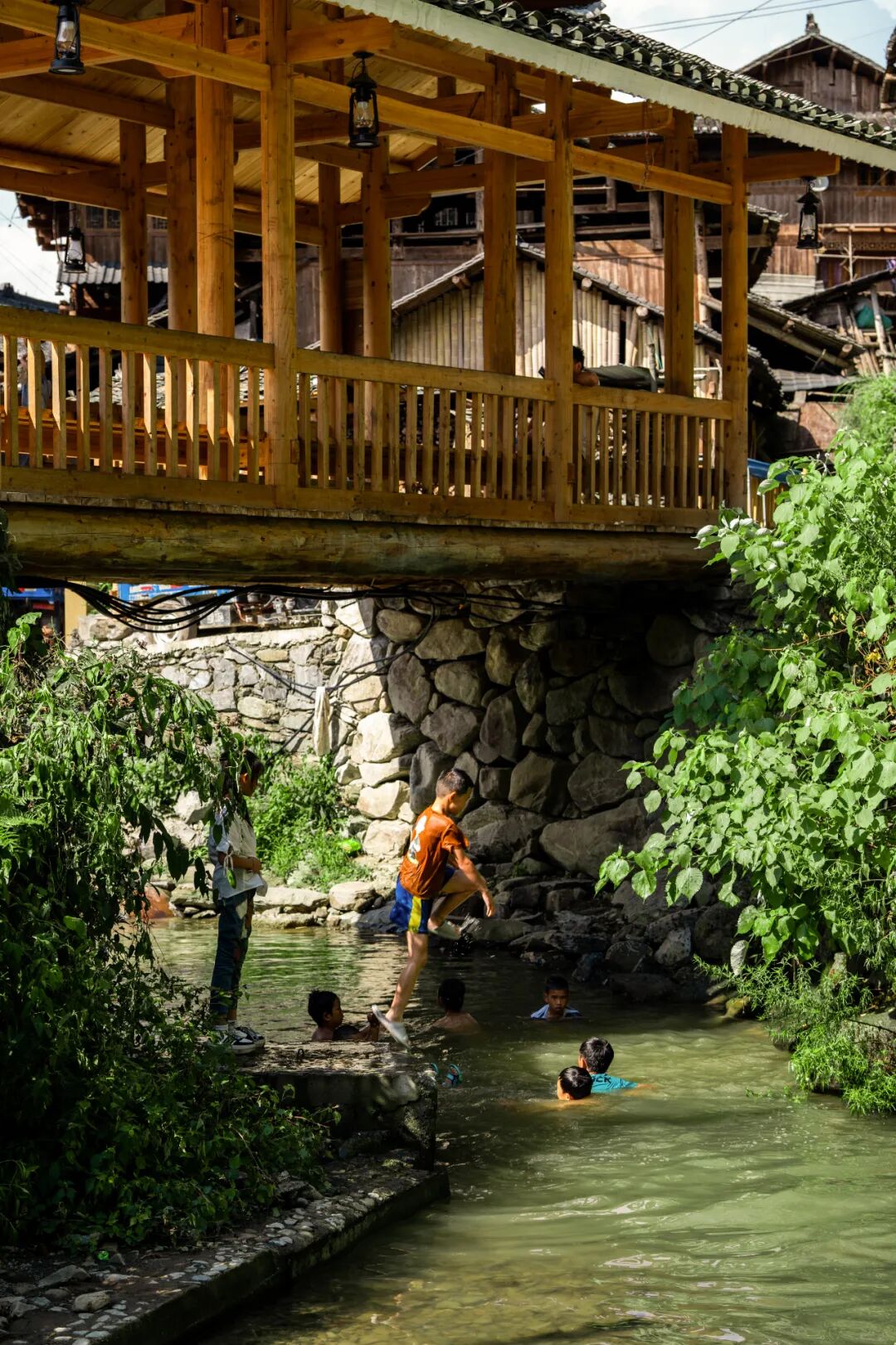 下图:在大利侗寨风雨桥下戏水的孩童。