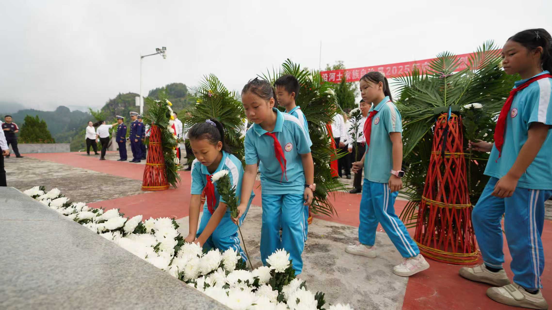岁月无声,丰碑为证。在庄严肃穆的气氛中,全体人员整齐列队,奏唱中华人民共和国国歌,并默哀。默哀毕,少先队员献唱《我们是共产主义接班人》,用歌声表达对祖国的热爱和对革命烈士的崇敬。随后,10名礼兵稳抬花篮、缓步向前,向烈士纪念碑敬献花篮。罗洪祥、代忠义、刘明军、杨超等县领导缓步上前,仔细整理花篮缎带;其他领导干部和各界代表依序敬献鲜花,并缓缓绕行烈士纪念碑一周,瞻仰烈士纪念碑,向英烈们表达崇高敬意。