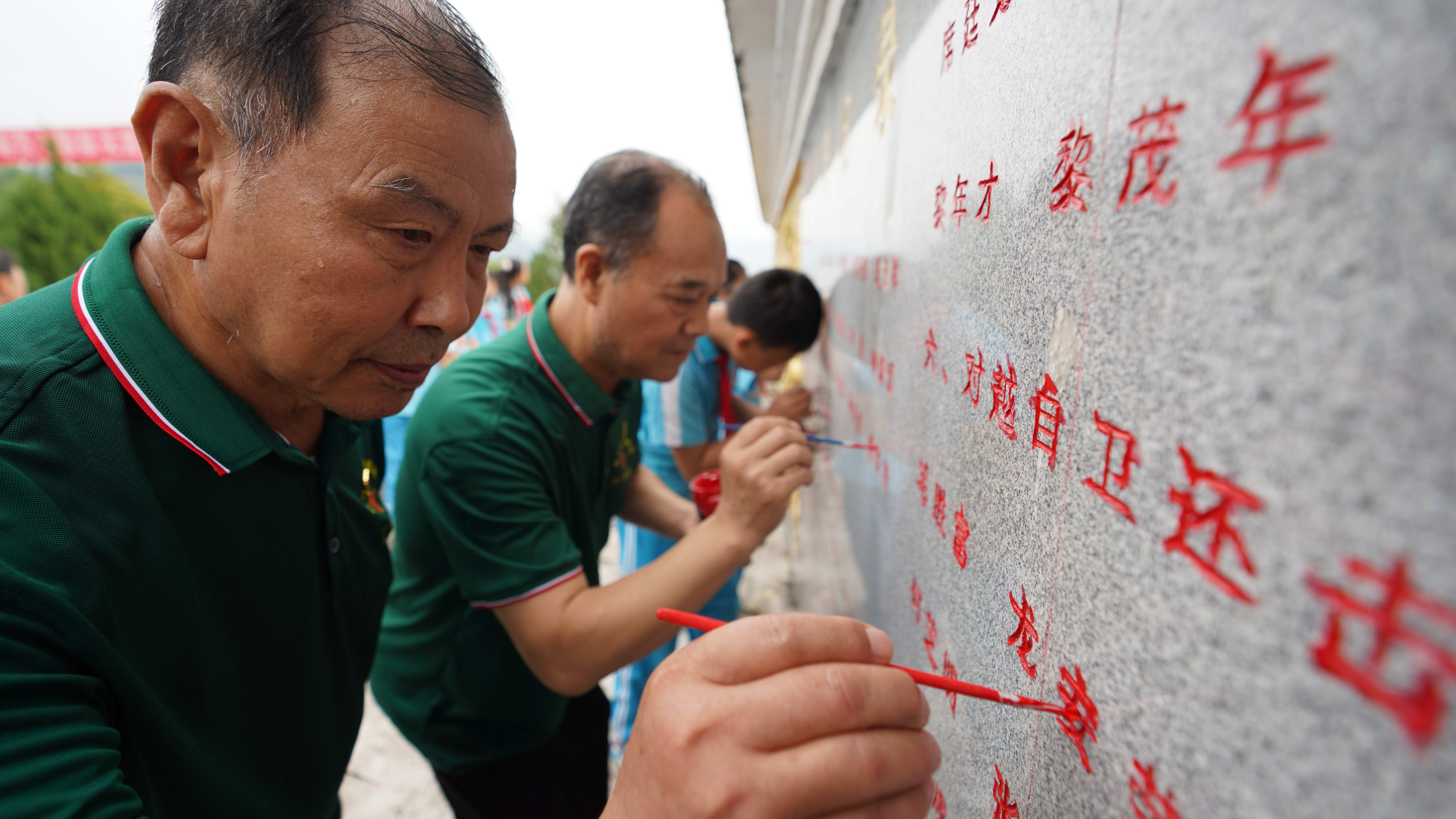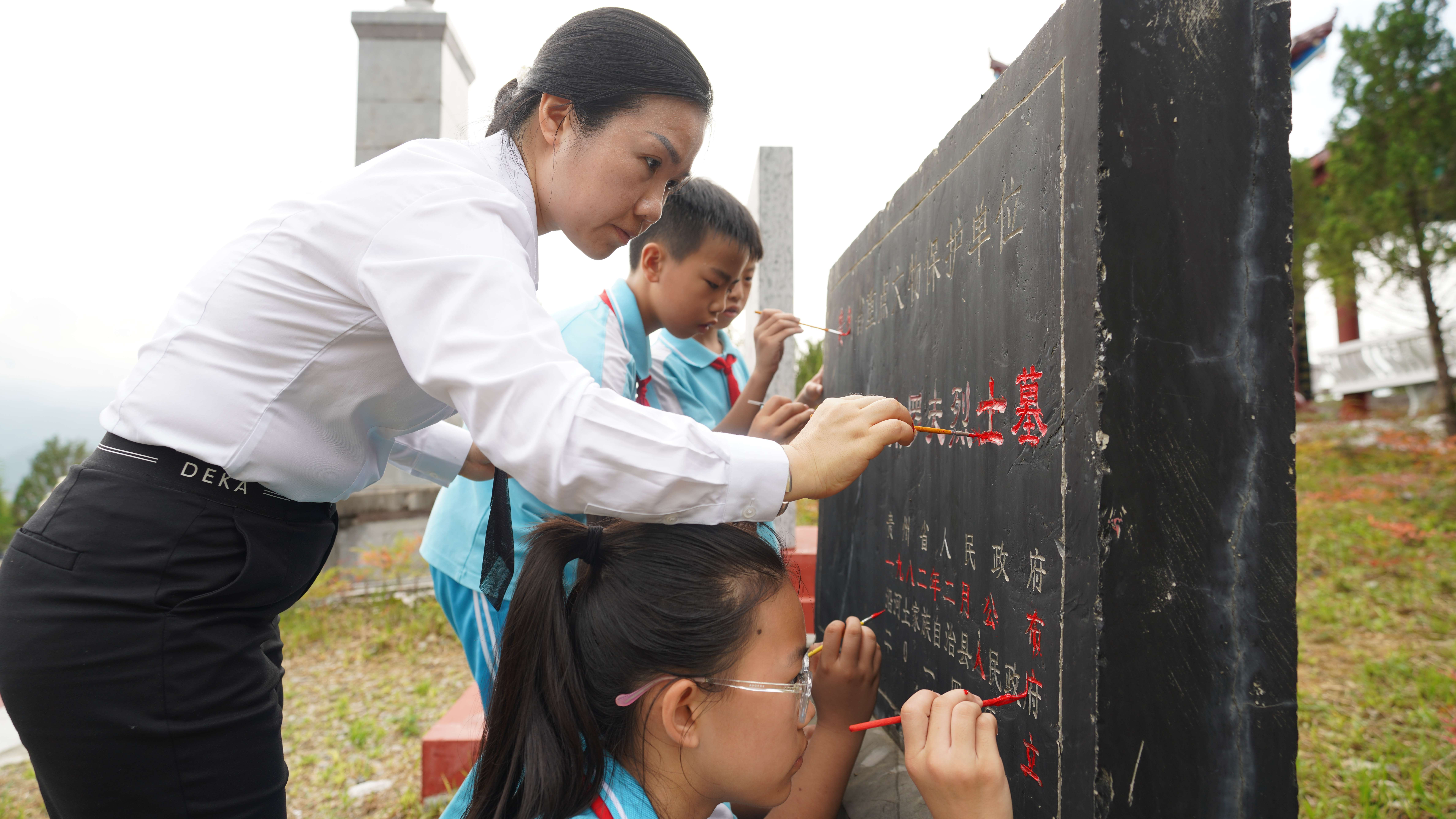 最后,少先队员在参战老兵的带领下,一笔一划为墓碑上和烈士英名录中模糊的字迹添色描红,并清理碑面上的尘土。