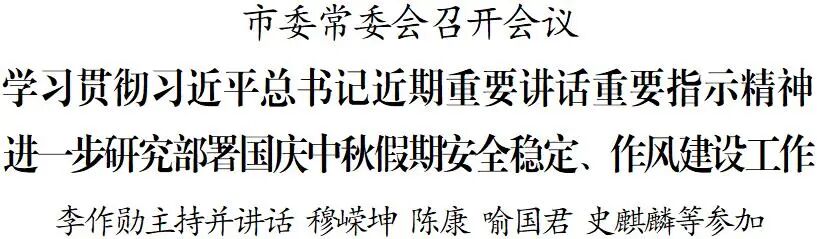 9月30日,市委常委会召开会议,学习贯彻习近平总书记近期重要讲话重要指示精神,研究部署作风建设、行业协会商会党建工作,对国庆中秋假期安全稳定工作进行再安排、再部署。