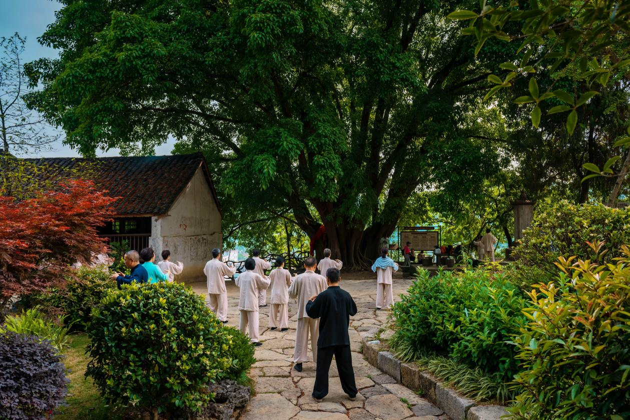 古榕树下,旅居的老人们在锻炼身体。受访者供图