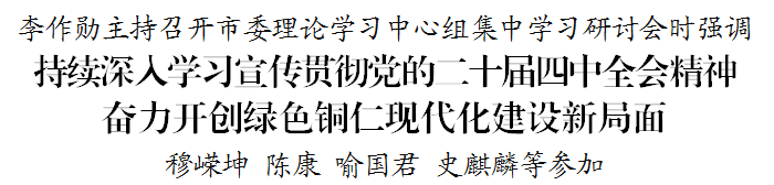 11月4日,市委理论学习中心组集中学习研讨会举行,围绕学习贯彻党的二十届四中全会精神开展学习研讨。市委书记李作勋主持并讲话。他强调,要深入学习宣传贯彻党的二十届四中全会精神,科学谋划编制“十五五”规划,始终坚持生态文明引领高质量发展,一棒接着一棒跑,一锤接着一锤敲,奋力开创绿色铜仁现代化建设新局面。